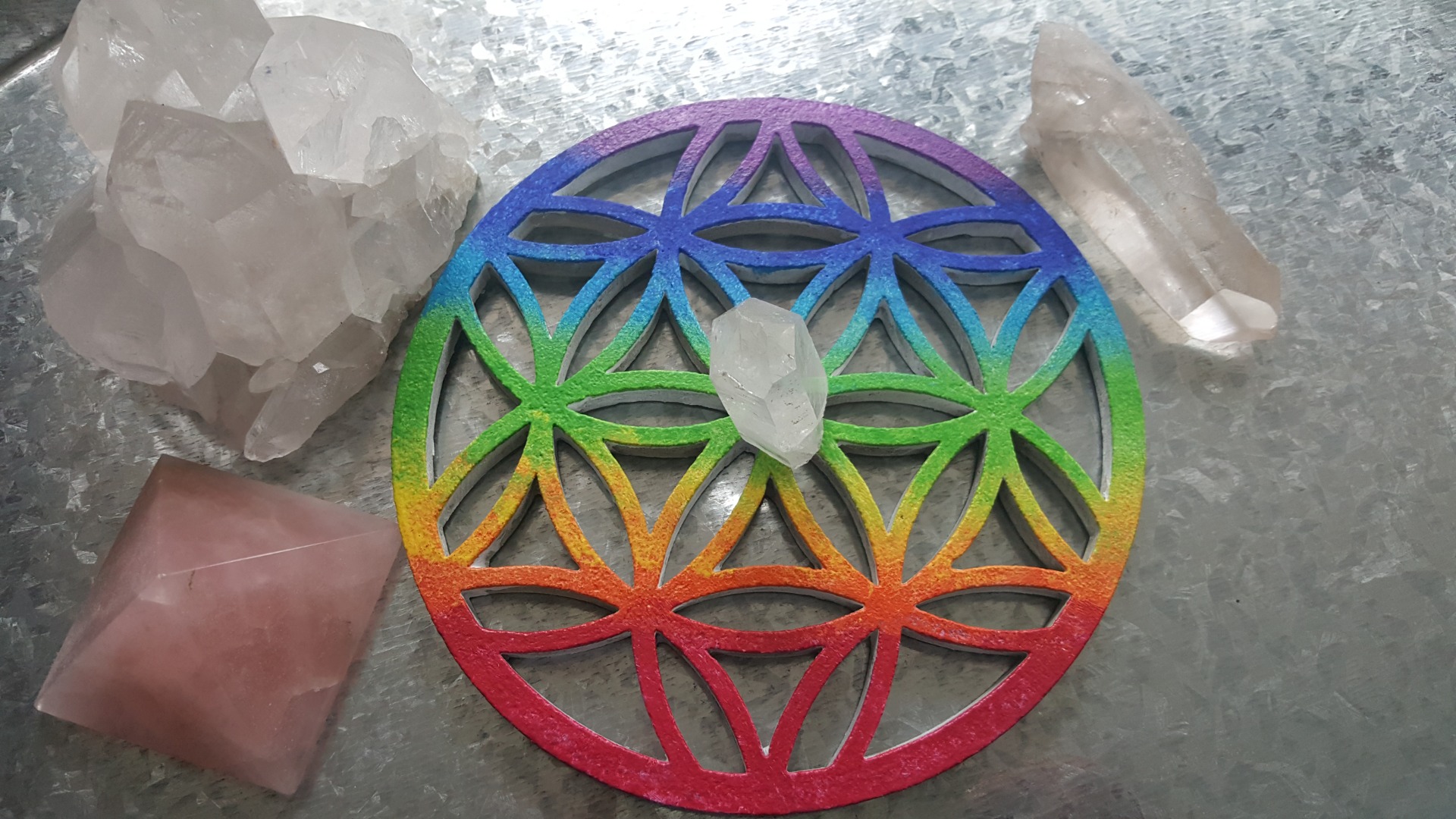 Die Blume des Lebens macht sich schön als energetisches Wandbild, dient auch als Untersetzer, Gartendeko oder Traumfänger...